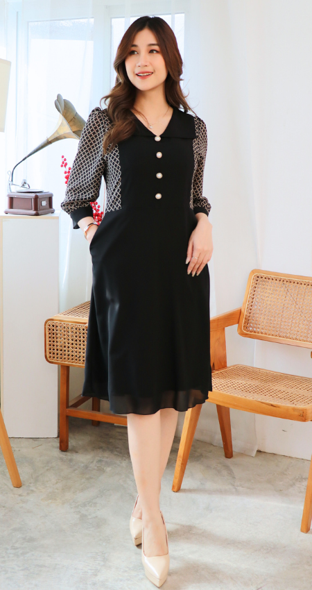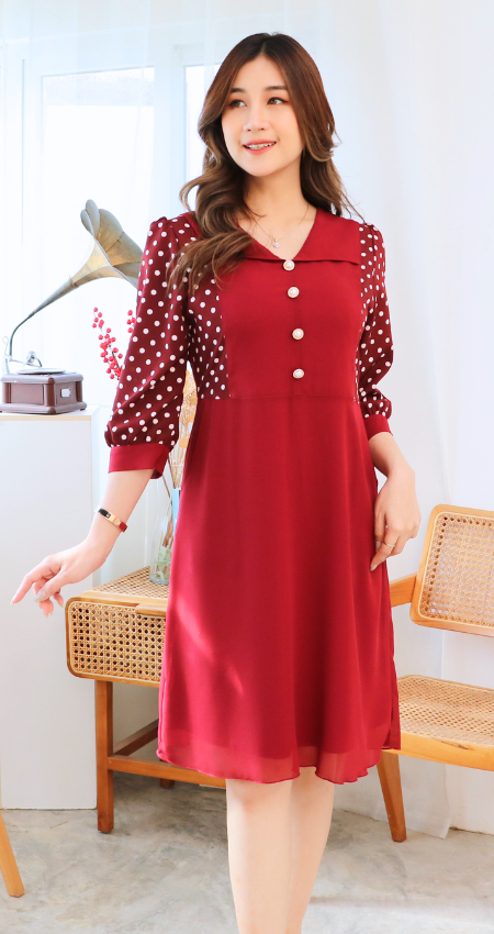 (ภาษาไทย) ชุดเดรสสวยเหมือนสั่งตัด ชุดเดรสสาวอวบ แขนตกแต่งลาย สีแดง สีดำ ผลิตจากผ้าชีฟองเนื้อทราย มีไซส์ 38 40 42 44 46