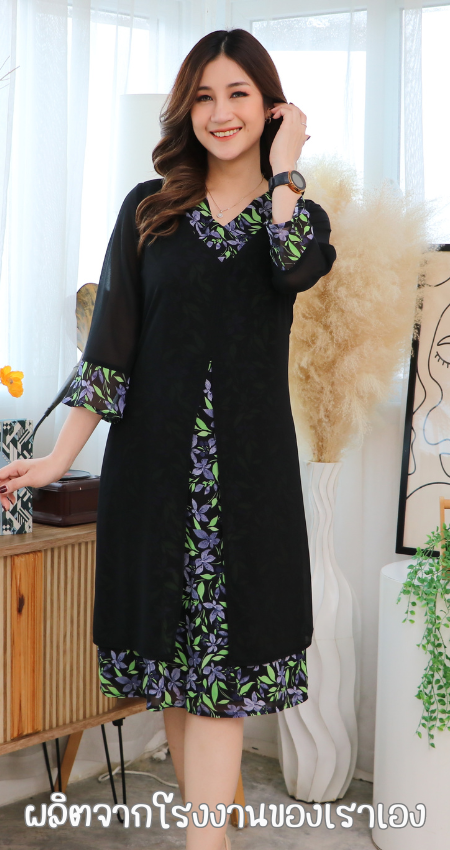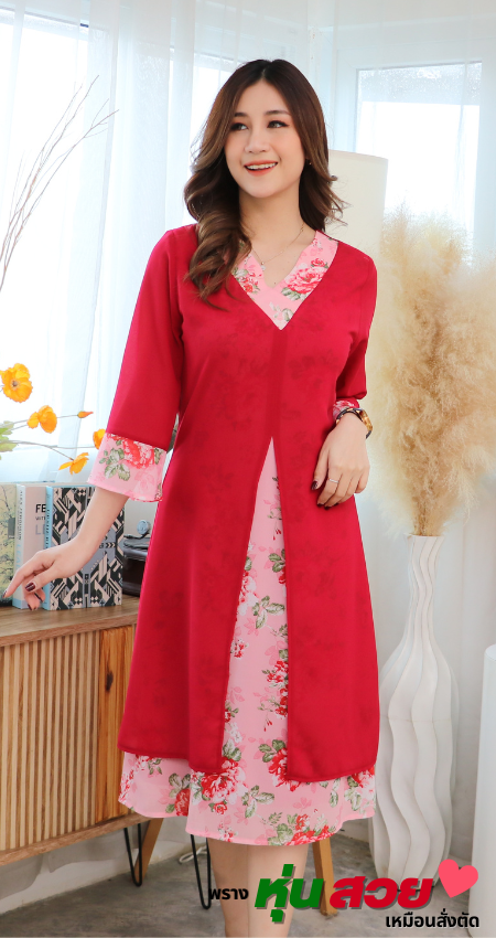 (ภาษาไทย) ชุดเดรสสวยเหมือนสั่งตัด ชุดเดรสสาวอวบ วีคอสาป สีแดง ผลิตจากผ้าชีฟองเนื้อทราย มีไซส์ 38 40 42 44 46