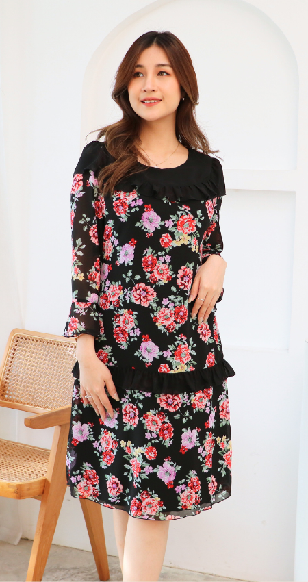 (ภาษาไทย) เดรสชีฟองเนื้อทราย มีซับใน กลมระบาย เดรสสาวอวบสาวอ้วน BLUECHERRY SHOP ไซส์ 38 40 42 44 46