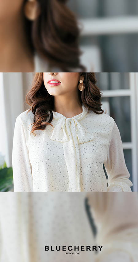 (ภาษาไทย) เสื้อชีฟองเนื้อทราย มีซับใน สีขาวลายจุด คอผูกโบว์แขนระบาย2ชั้น เสื้อสาวอวบ เสื้อสาวอ้วน BLUECHERRY SHOP