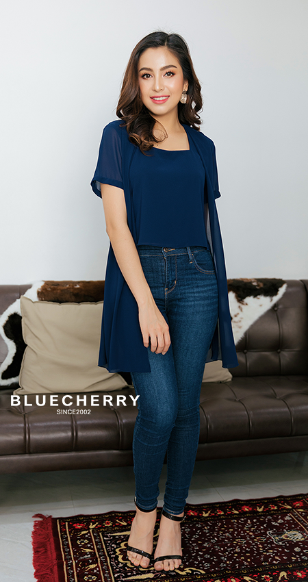 (ภาษาไทย) เสื้อชีฟองมีซับใน สีกรมท่า เสื้อสาวอวบ เสื้อสาวอ้วน เสื้อคลุมยาว BLUECHERRY SHOP